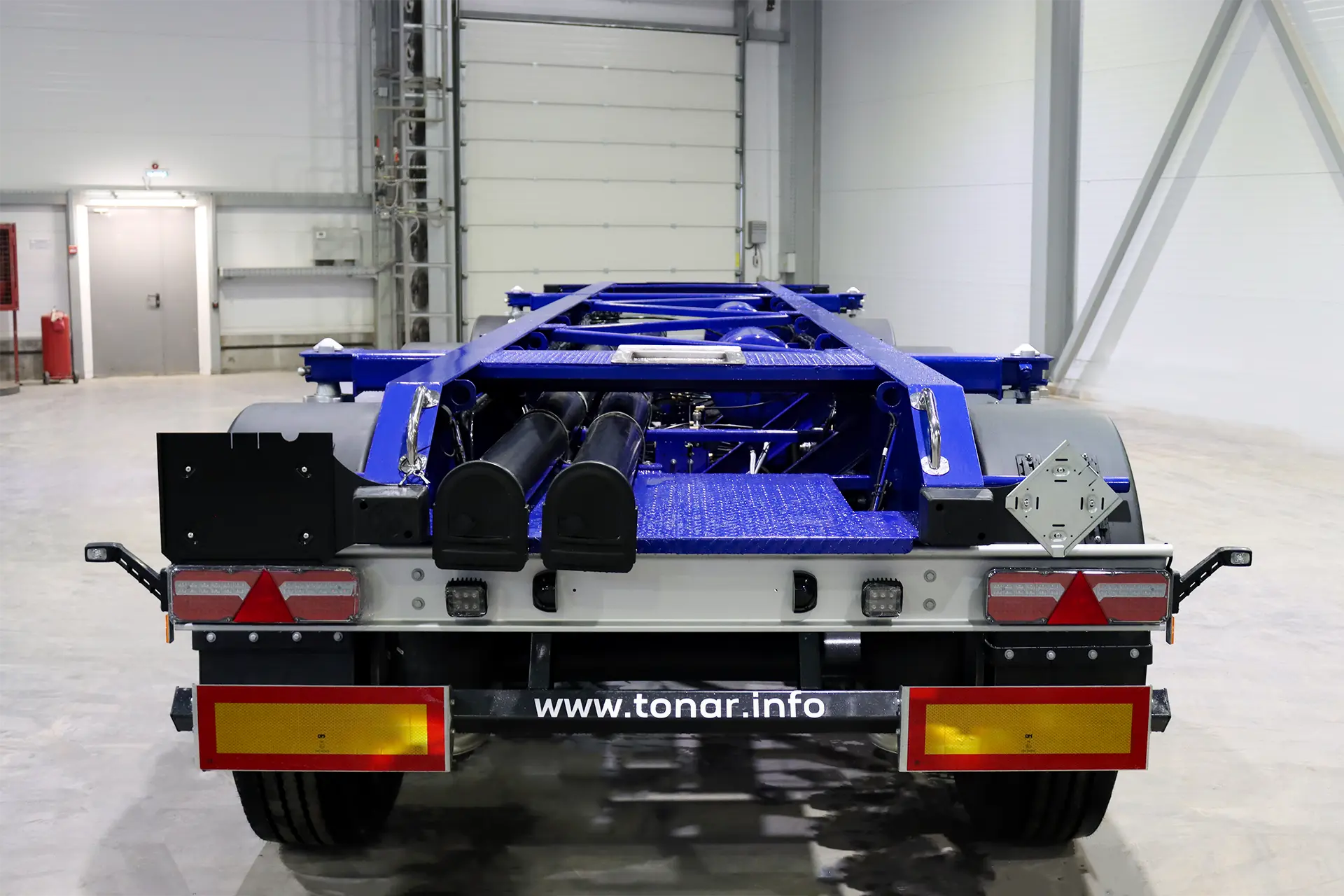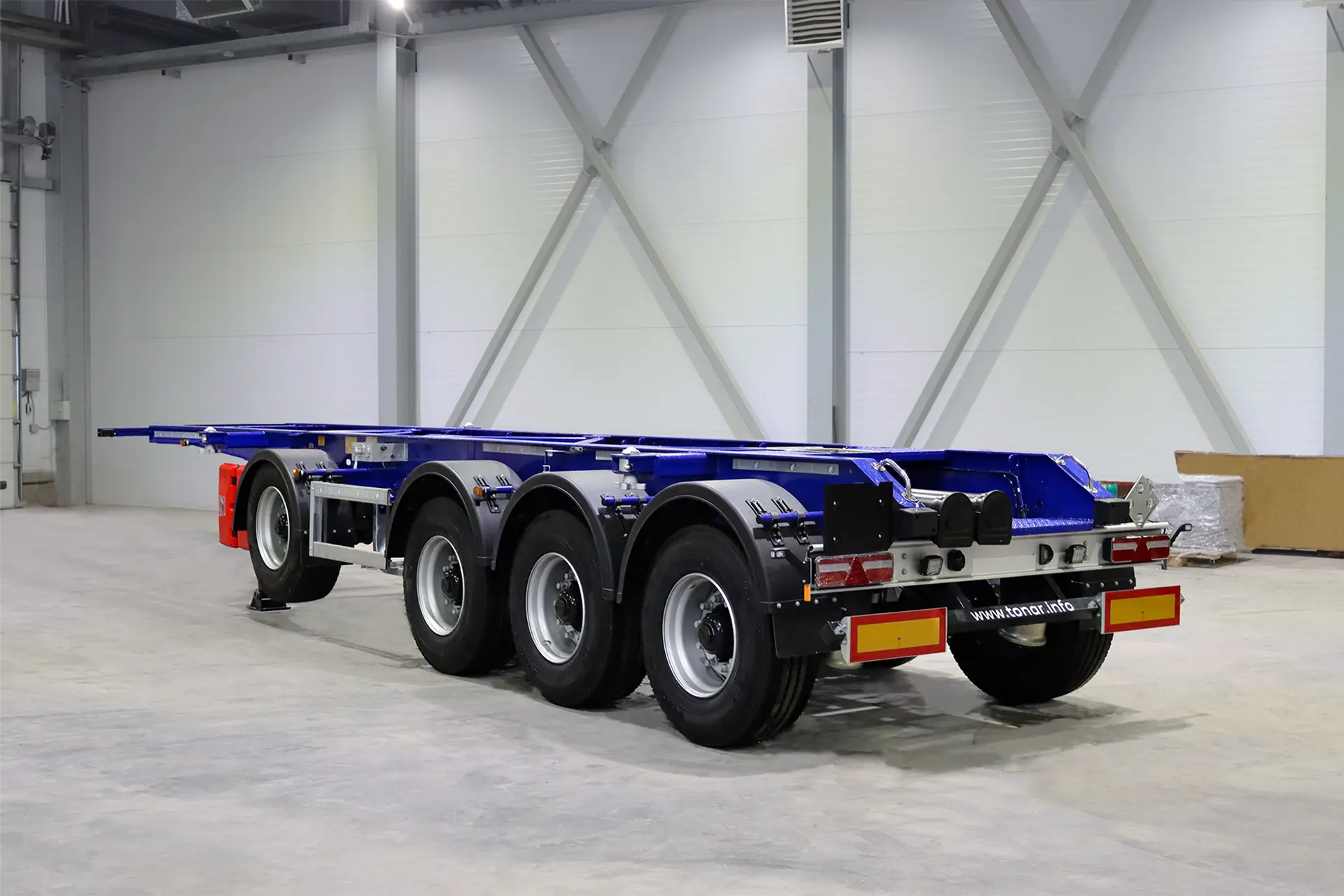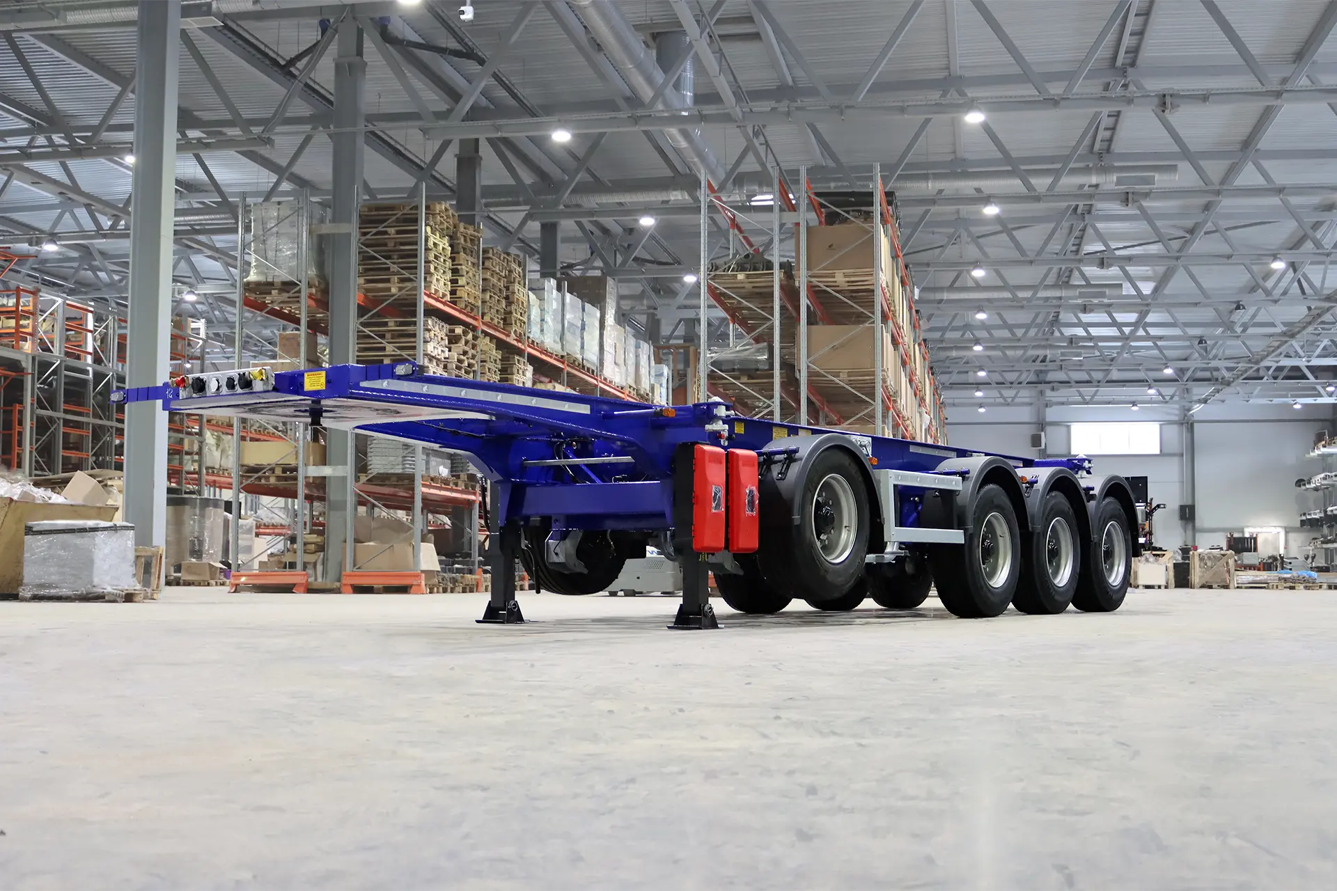Полуприцеп разработан с учетом специфики танк‑контейнеров: увеличенного веса (включая массу груза), особых требований к устойчивости и необходимости минимизировать риски при транспортировке опасных веществ.